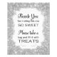 This silver sparkly candy buffet sign will be the perfect compliment to the candy bar at your wedding, birthday, bridal shower or baby shower. It features a silver sparkle background with a frame cutout with the phrase "Thank you for making this day so sweet Please take a bag and fill it with treats".