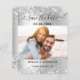 A modern wedding Save the Date photo card. A faux silver looking background decorated with faux glitter, sparkles. Personalise and add your photo, wedding details.