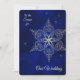 This winter wedding invitation has a silver white stylized snowflake star against a dark blue night sky background. Scattered silver stars in the distance add a romantic touch. The text in silver white at the upper left corner says " 'tis the Season for", and the bottom says "Our Wedding". The back holds your wedding text in silver on the same blue background. All the text is easily customized. Elegant!