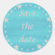 Painting of a circle of silver stars on a background of blended light blues with Save the date, in silver, is printed on stickers.