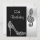Womens' personalised, elegant custom 55th Birthday cards with glitz and glamour. Woman's beautiful silver and black double sided Birthday invitation with a stunning glamourous printed image rhinestones, glitter, sequins, diamonds bling jewels sparkle high heels stilettos fashion shoe, and glittery silver and black treble cleft on a black and silver background. The reverse of this pretty feminine birthday invite has the same design with enough space for you to personalise with your event details. Chic, classy, cute, girly, modern cards for birthday parties, in trendy, fashionable colours / colours. These groovy, fancy, stylish, sophisticated, pretty, girlie cards are decorated / printed on both sides. PLEASE NOTE: All products on Zazzle have flat printed images.