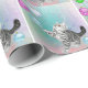 Silver tabby kitten looks at and starts to play with Christmas decorations and ornaments cat lovers Christmas wrapping paper