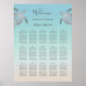 Two elegant silver sea turtles on a an abstract beach style gradient background. Wedding reception seating list poster with a welcome text, your bride and groom names in an elegant script and text fields for 100 guests.