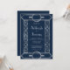 This elegant vintage-inspired wedding invitation features silver grey text on a navy blue background, framed by a stylish vintage geometric art deco border in faux silver foil. The reverse side is solid navy blue.