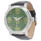 Silver watch with intricate tree design on green face and black leather strap. Back view shows engraved branding and strap details. Elegant and artistic.