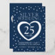 Silver wedding anniversary 25 years party dark blue and silver foil on front. twenty-fifth silver wedding anniversary party event with two photos on the reverse. Personalise with your own wedding anniversary party details and two photos in the silver hearts one now and one from their wedding 25 years ago. Other matching items are available. Art and design by www.mylittleeden.com on Zazzle.