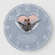 25th silver heart wedding anniversary clock personalize with your own couples photo, year of marriage, and names or relationship to you. The example reads Emily & Matthew Vermeulen Silver Wedding Anniversary and your marriage and current date and has clock plain numbers around the outside. Other matching twenty-five years married silver wedding anniversary heart gifts and cards are available. Precious metal silver heart effect graphic art and design by Sarah Trett for www.mylittleeden.com (Placeholder photo image thanks to Crystal Shaw at Unsplashed)