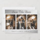 Elegant silver wedding photo save the date cards featuring an engagement photo collage on a silver background. Personalised silver wedding save the date cards. Customisable silver wedding save the date cards. Large numbers wedding save the date cards. 3 photo save the date cards. Silver photo collage save the date cards.