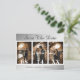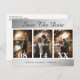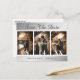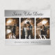 Elegant silver wedding photo save the date postcards featuring an engagement photo collage on a silver background. Personalised silver wedding save the date cards. Customisable silver wedding save the date cards. Large numbers wedding save the date cards. 3 photo save the date cards. Silver photo collage save the date postcards.