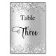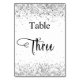 The table number is written with an elegant hand lettered style script. Black letters, a white background on front and faux silver background with faux glitter dust, sparkles on the back.