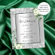Faux silver looking background decorated with white florals, flowers, eucalyptus greenery and faux silver glitter, sparkles. Personalise and add your names and wedding details. Black letters.