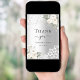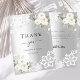 A modern and elegant non photo thank you card. A faux silver looking background. Decorated with white roses, florals flowers and white lace. On the front the text: Thank You