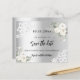 A modern and elegant Save the Date for a 50th birthday party. A faux silver looking background, decorated with white flowers and white lace. Personalise and add a date and name. The text: Save the Date is written with a large trendy hand lettered style script.