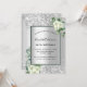 Faux silver looking background decorated with white florals, flowers, eucalyptus greenery and faux silver confetti. Personalise and add your name and party details. Black letters.
