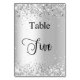 The table number is written with an elegant hand lettered style script. Black letters, a white background on front and faux silver background with faux glitter dust, sparkles on the back.