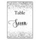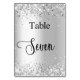 The table number is written with an elegant hand lettered style script. Black letters, a white background on front and faux silver background with faux glitter dust, sparkles on the back.