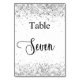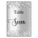 The table number is written with an elegant hand lettered style script. Black letters, a white background on front and faux silver background with faux glitter dust, sparkles on the back.