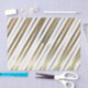 Holiday tissue paper with a diagonal stripe design of gold, white, and silver.