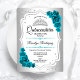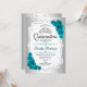Quinceanera party invitation. Stylish design in teal and faux glitter silver. Features script font, white roses, tiara and confetti. Perfect for a classy glam princess style 15th birthday celebration. Printed Zazzle invitations or instant download digital printable template.