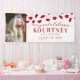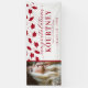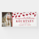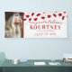Celebrate your graduate's achievement with our modern graduation party banner. Featuring a customisable white background, a personalizable photo of the graduate, playful falling red mortarboard caps, and a sleek text template. This banner effortlessly merges style and celebration, making it a standout piece at any party.