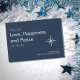 Simple New Year Peace 2026 holiday card, with a white typography design on a navy blue background. With customisable lettering, you can add your own family name. A white snowflake image accents the front of the card and with a white background on the back. A lovely way to send your wishes of love and peace in the new year.