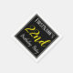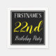 This simple and elegant paper napkin design features a message like "FirstName’s 22nd Birthday Party", with the "22nd" in fancy yellow-coloured text, within a black-coloured square area featuring a simple border outline. A custom name can be used. Napkins like these could perhaps be used at a birthday party for somebody who is celebrating their twenty second birthday. [~Z0000150]