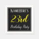 This simple and elegant paper napkin design features a message like "NameHere’s 23rd Birthday Party", with the "23rd" in fancy yellow-coloured text, within a black-coloured square area featuring a simple border outline. The name can be personalised. Napkins like these could perhaps be used at a birthday party for somebody who is celebrating their twenty third birthday. [~Z0000150]