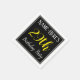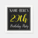 This simple and elegant paper napkin design features a message like "Name-Here’s 29th Birthday Party", with the "29th" in fancy yellow-coloured text, within a black-coloured square area featuring a simple border outline. A custom name can be used. Napkins like these could perhaps be used at a birthday party for somebody who is celebrating their twenty ninth birthday. [~Z0000150]
