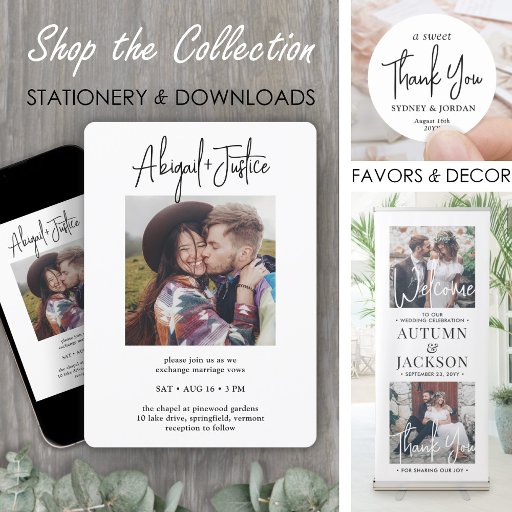 Invite family and friends to a simply stylish wedding celebration with unique square all-in-one QR code invitations. With just one card you can invite wedding guests to your upcoming special day celebration, provide all of the important details (such as directions, registry, hotel accommodations), and let the website organise the rsvp's. No additional enclosure cards are needed. The 2 pictures and all wording are simple to personalise. (IMAGE PLACEMENT TIP: An easy way to position a photo exactly how you want is to crop it before uploading to the Zazzle website.) The modern minimalistic black and white design features two square pictures of the engaged couple, two custom QR codes, casual trendy handwritten script, and elegant classic typography. By scanning the QR codes with their phones, guests are sent directly to the wedding website for more details and to reply to the invitation. An online rsvp process reduces the chance that cards will be lost in the mail. It's also more versatile, in that you can ask for more specific response information, such as meal choices, food allergies, and song requests. This informal yet elegant contemporary invitation makes a stylish addition to an upcoming special day celebration. Congratulations to the bride and groom!