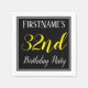 This simple and elegant paper napkin design features a message like "FirstName’s 32nd Birthday Party", with the "32nd" in fancy yellow-coloured text, within a black-coloured square area featuring a simple border outline. The name can be personalised. Napkins like these could perhaps be used at a birthday party for somebody who is celebrating their thirty second birthday. [~Z0000150]