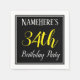 This simple and elegant paper napkin design features a message like "NameHere’s 34th Birthday Party", with the "34th" in fancy yellow-coloured text, within a black-coloured square area featuring a simple border outline. The name can be personalised. Napkins like these could perhaps be used at a birthday party for somebody who is celebrating their thirty fourth birthday. [~Z0000150]