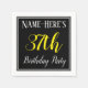 This simple and elegant paper napkin design features a message like "Name-Here’s 37th Birthday Party", with the "37th" in fancy yellow-coloured text, within a black-coloured square area featuring a simple border outline. A custom name can be used. Napkins like these could perhaps be used at a birthday party for somebody who is celebrating their thirty seventh birthday. [~Z0000150]