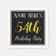 This simple and elegant paper napkin design features a message like "Name-Here’s 54th Birthday Party", with the "54th" in fancy yellow-coloured text, within a black-coloured square area featuring a simple border outline. The name can be customised. Napkins like these could perhaps be used at a birthday party for somebody who is celebrating their fifty fourth birthday. [~Z0000150]