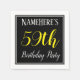 This simple and elegant paper napkin design features a message like "NameHere’s 59th Birthday Party", with the "59th" in fancy yellow-coloured text, within a black-coloured square area featuring a simple border outline. The name can be personalised. Napkins like these could perhaps be used at a birthday party for somebody who is celebrating their fifty ninth birthday. [~Z0000150]