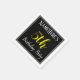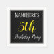 This simple and elegant paper napkin design features a message like "NameHere’s 5th Birthday Party", with the "5th" in fancy yellow-coloured text, within a black-coloured square area featuring a simple border outline. A custom name can be used. Napkins like these could perhaps be used at a birthday party for somebody who is celebrating their fifth birthday. [~Z0000150]