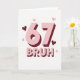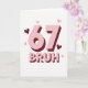 This greeting card features a big “67” in soft pastel pink, styled to look three-dimensional with deep maroon shadows on a white background. Just below it, the word “BRUH” appears in the same pink lettering with the same maroon shadow, centered and easy to notice. Small hearts are scattered around the numbers and word, some light pink and some maroon, adding a little extra love without crowding the space. The overall look is simple and modern, with lots of white space that keeps everything feeling open and clear. It comes across funny and affectionate at the same time, like a friendly tease paired with a hug 🥰. This feels meaningful to give because it can celebrate someone’s age while also showing you know their sense of humor and care about them ❤️.