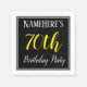 This simple and elegant paper napkin design features a message like "NameHere’s 70th Birthday Party", with the "70th" in fancy yellow-coloured text, within a black-coloured square area featuring a simple border outline. A custom name can be used. Napkins like these could perhaps be used at a birthday party for somebody who is celebrating their seventieth birthday. [~Z0000150]