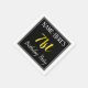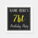 This simple and elegant paper napkin design features a message like "Name-Here’s 71st Birthday Party", with the "71st" in fancy yellow-coloured text, within a black-coloured square area featuring a simple border outline. The name can be customised. Napkins like these could perhaps be used at a birthday party for somebody who is celebrating their seventy first birthday. [~Z0000150]