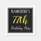 This simple and elegant paper napkin design features a message like "NameHere’s 77th Birthday Party", with the "77th" in fancy yellow-coloured text, within a black-coloured square area featuring a simple border outline. A personalised name can be used. Napkins like these could perhaps be used at a birthday party for somebody who is celebrating their seventy seventh birthday. [~Z0000150]