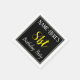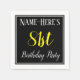 This simple and elegant paper napkin design features a message like "Name-Here’s 81st Birthday Party", with the "81st" in fancy yellow-coloured text, within a black-coloured square area featuring a simple border outline. The name can be personalised. Napkins like these could perhaps be used at a birthday party for somebody who is celebrating their eighty first birthday. [~Z0000150]