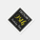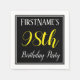 This simple and elegant paper napkin design features a message like "FirstName’s 98th Birthday Party", with the "98th" in fancy yellow-coloured text, within a black-coloured square area featuring a simple border outline. A personalised name can be used. Napkins like these could perhaps be used at a birthday party for somebody who is celebrating their ninety eighth birthday. [~Z0000150]