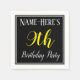 This simple and elegant paper napkin design features a message like "Name-Here’s 9th Birthday Party", with the "9th" in fancy yellow-coloured text, within a black-coloured square area featuring a simple border outline. A custom name can be used. Napkins like these could perhaps be used at a birthday party for somebody who is celebrating their ninth birthday. [~Z0000150]