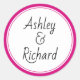 Simple and elegant names magenta fuchsia pink and white wedding Classic Round Sticker that features your names on white with a magenta border. It coordinates with our "Magenta tropical leaves" wedding collection.