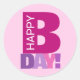 A set of simple and fun girly pinkish Happy Birthday round stickers with the words "Happy Bday!" in various shades of pink and purple. Colours of the letters can be changed -- click "Customise".