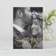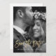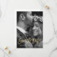 Simple and modern black and white wedding save the date features trendy calligraphy script typography and one photo.