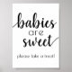 Modern "Babies are sweet: please take a treat" shower, party, or reception table signage featuring a fun, casual hand-lettered script. The classic design includes a modern handlettered quote typography overlay. The lovely font with a customisable background colour makes it easy to fit any theme. For other colours or matching products, please visit the JustFharryn Zazzle store, or contact the designer, c/o fharryn@yahoo.com All rights reserved. #zazzlemade