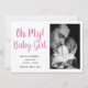 simple and modern script baby girl birth announcement template card featuring four pictures of your baby girl photos (front and back)! Customise this product by adding your child's birth stat at the bottom!