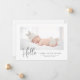 A simple and stylish photo birth template announcement 2-sided card features a photo of your newborn baby boy or girl, custom message that can be personalised, hand lettered typography text that says "Hello" with a script thank you and heart in between — above your message on back. You can customise baby's name and stats on front and thank you message on the back of the card. A place for a second picture on the back. ©Marisu Valencia