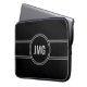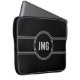 You can personalise the silver monogram that's in the centre of this black laptop sleeve. The text is inside of a black circle that has a double border. The circle's borders are silver. Four silver lines go across the sleeve.