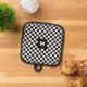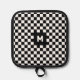 This black and white pot holder has a chequerboard pattern. Also, there's an initial in the centre. You can change the letter to the correct monogram.